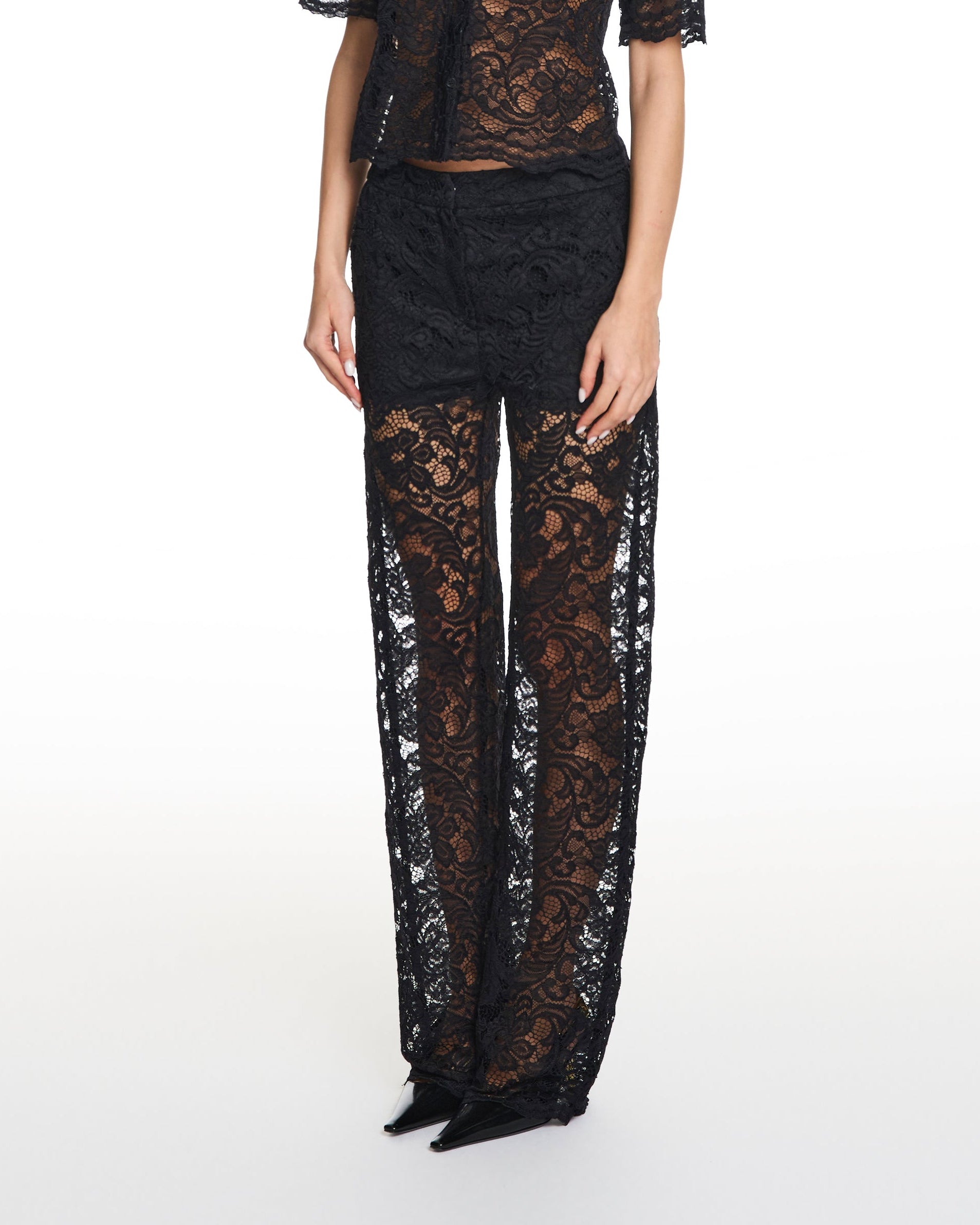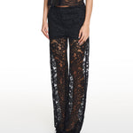 • High-waisted lace trousers crafted from delicate floral lace