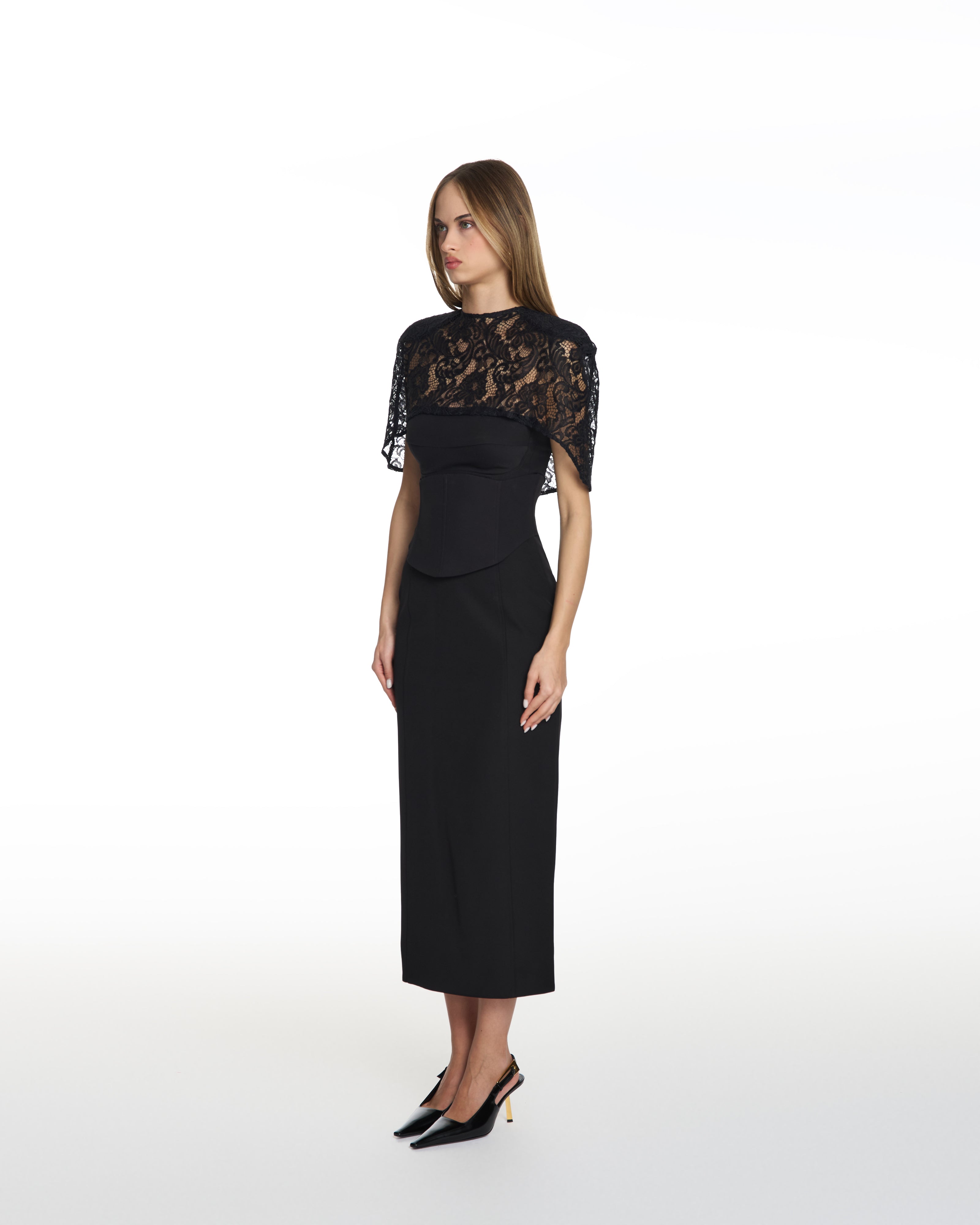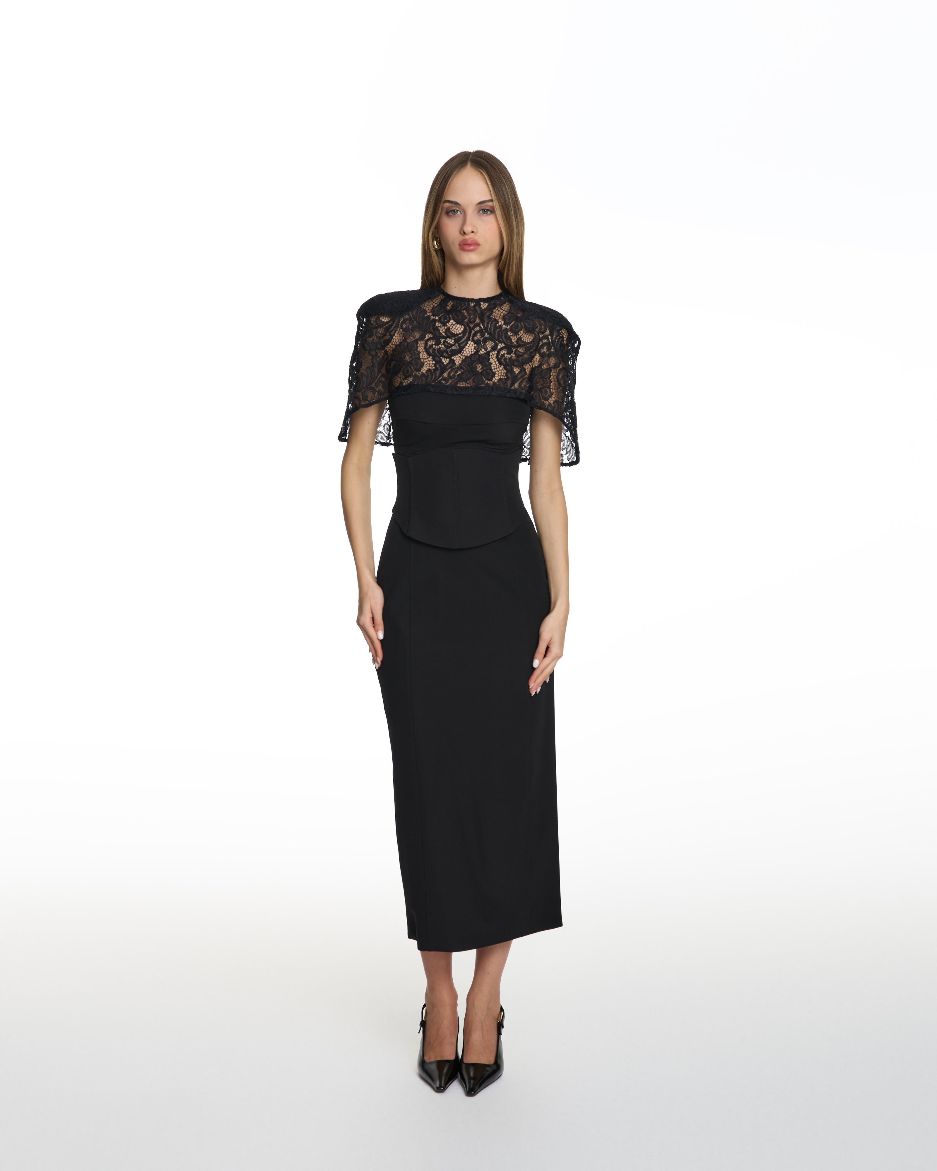 Envy Lace Cinched Black Midi Dress