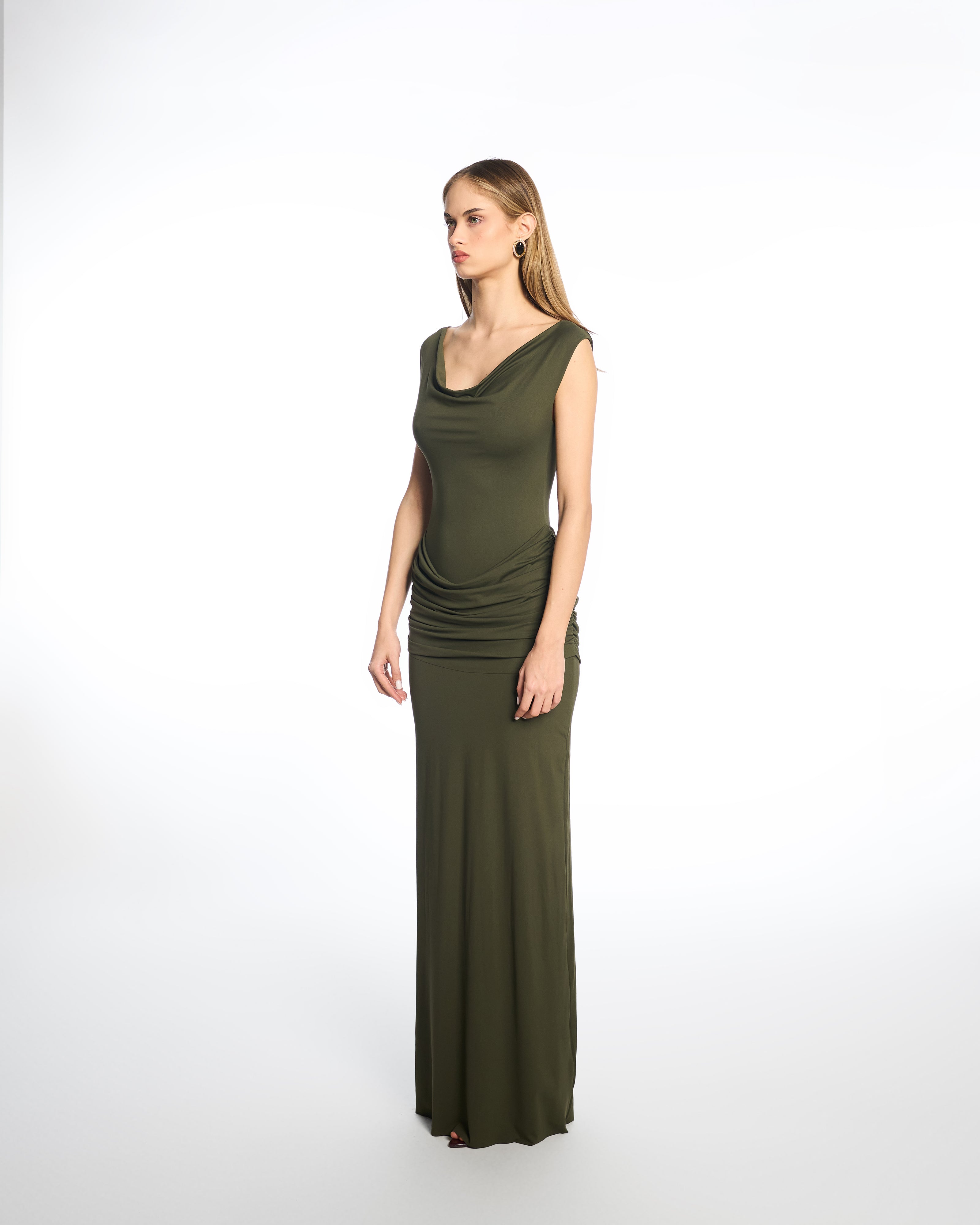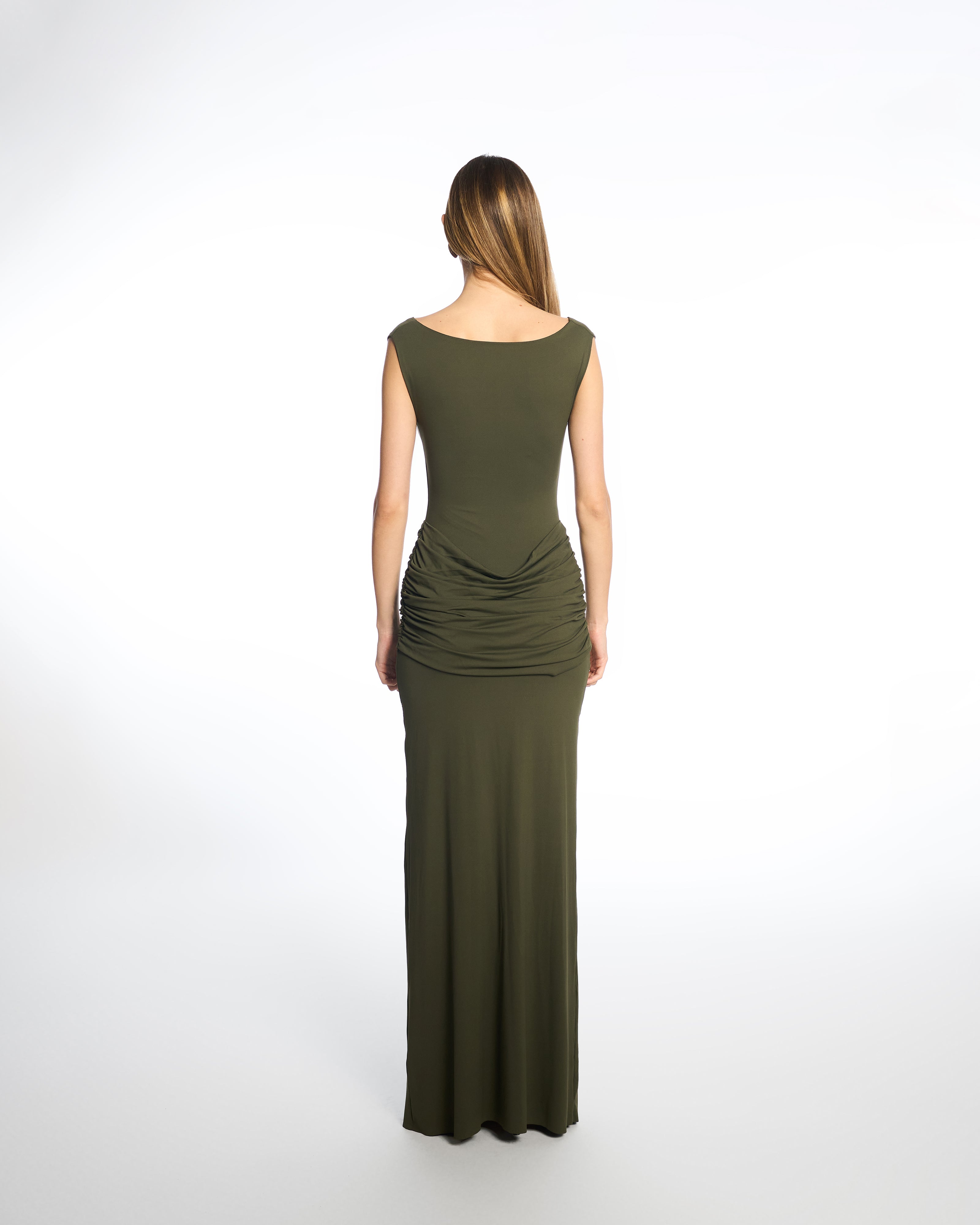 • Straight, floor-length silhouette with fluid movement
