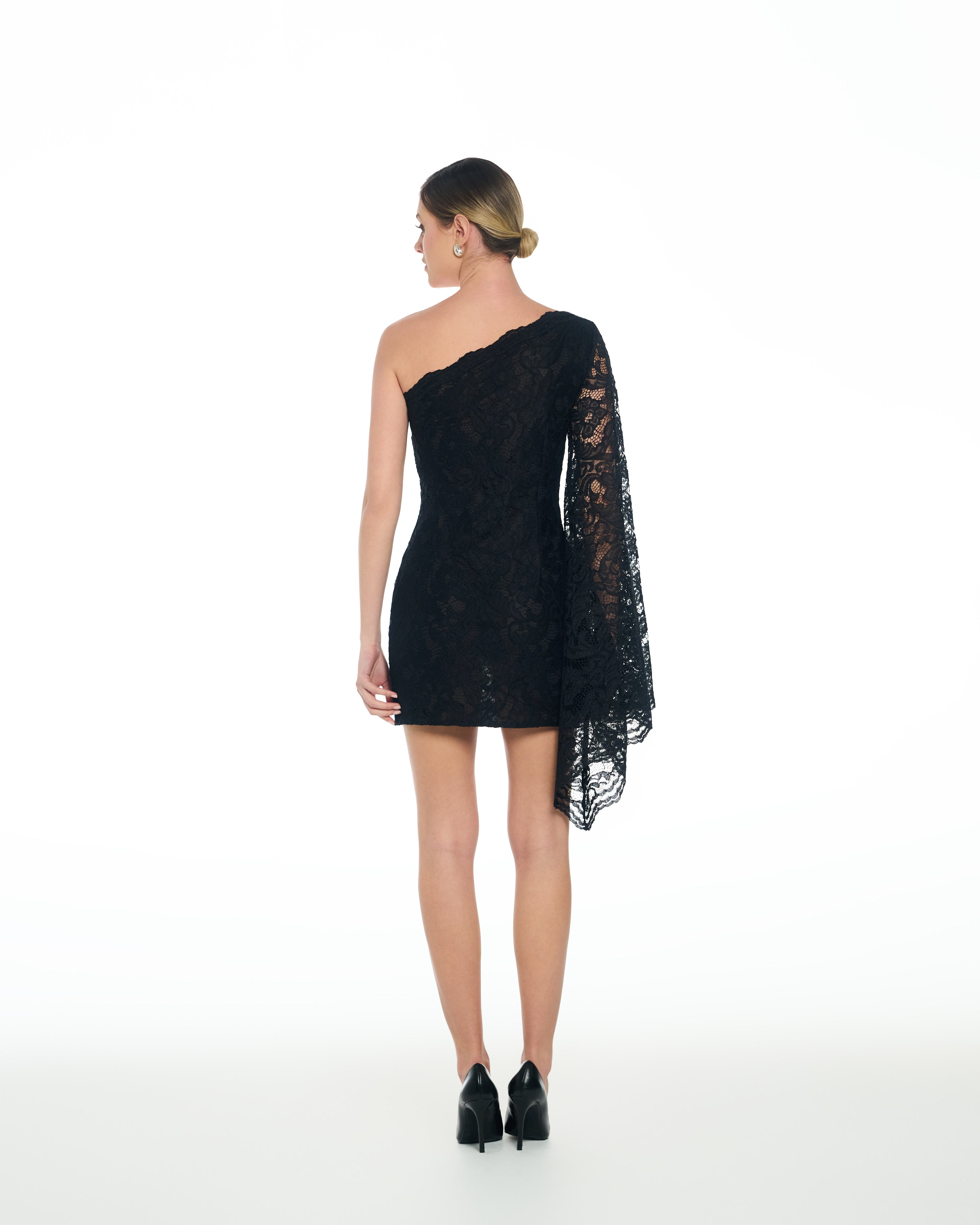 A fitted lace mini dress designed to sculpt the body and create a refined, feminine silhouette. The one-shoulder construction adds structure, while the long lace sleeve introduces movement and a dramatic, elegant finish.