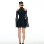 A fitted lace mini dress designed to sculpt the body while balancing elegance and boldness. The sheer illusion panel and high neckline create a refined silhouette, while the off-shoulder lace sleeves add softness and movement. Perfect for evening events, parties or special occasions.