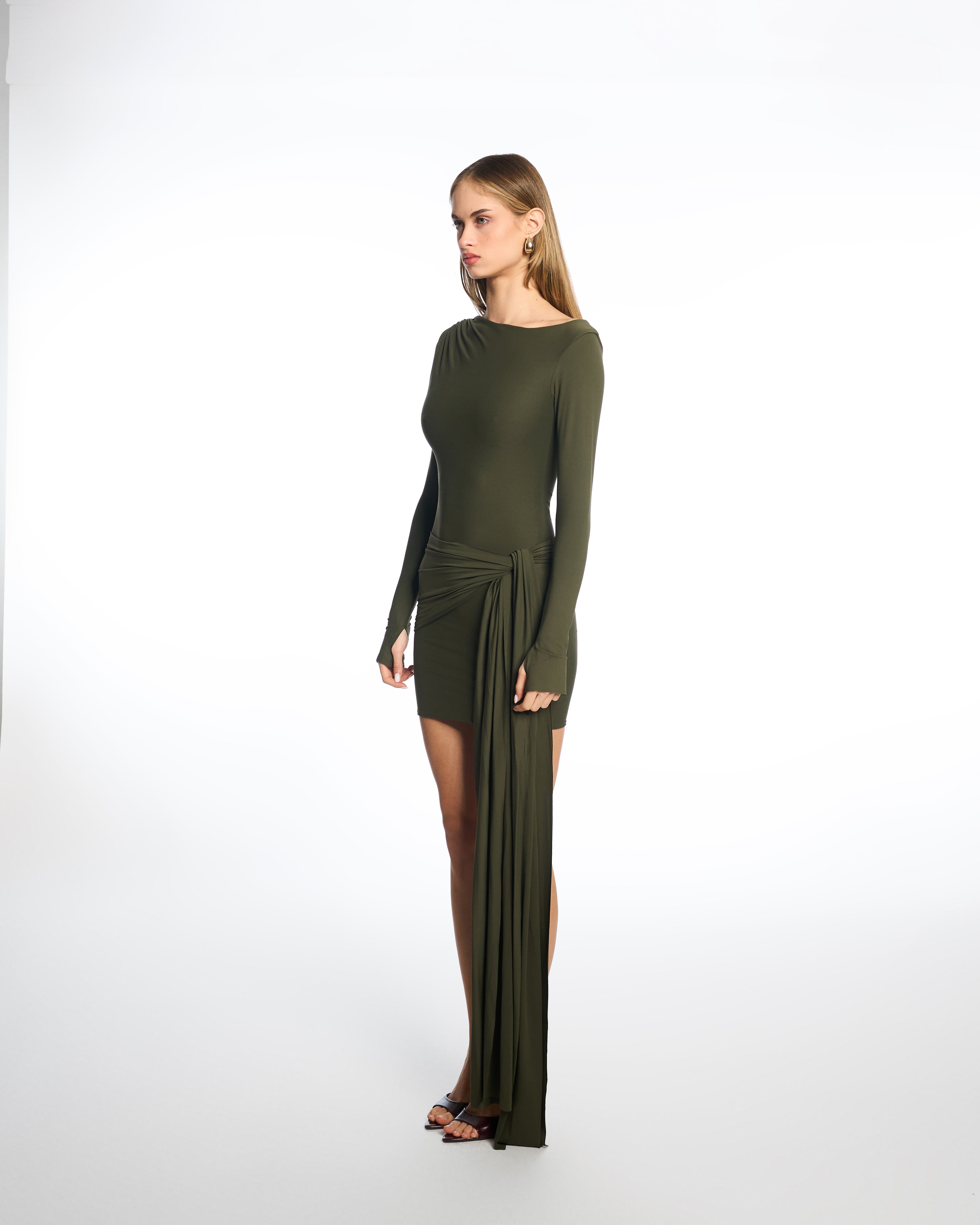 The Tina Long-Sleeves Mini Dress is crafted from luxurious Italian fabric, ensuring a sleek and comfortable fit. The stretchy elastic material hugs your body flawlessly, while the versatile neckline and gathered details add a touch of sophistication. With a playful nod to a scarf-like design and effortless movement, this dress offers the perfect balance of comfort and style. With long sleeves and a playful thumb whole, no need to hide your hands!